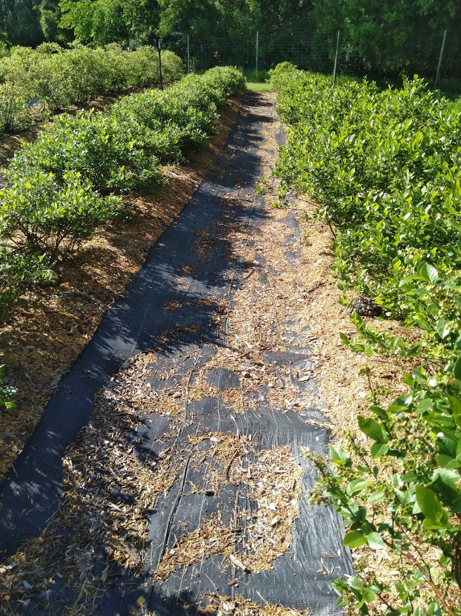 | Landscape fabric and woodchip mulch in a blueberry field near Stillwater, MN. Photo: Annie Klodd. |