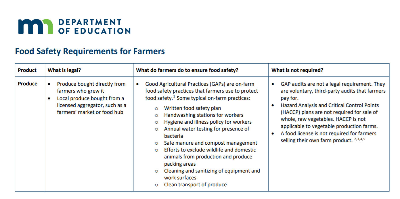 Food safety is sometimes a topic that is seen as creating a bottleneck or barriers for a farm selling to a new market, like a school or an institution. A farm might lack a food safety verification like a GAP audit that some buyers require, or sometimes a buyer thinks that local food is not legal to use in their food service setting. Two new resources help clarify what is required and what is allowed under Minnesota state food code when farms sell to markets like schools and other institutions.