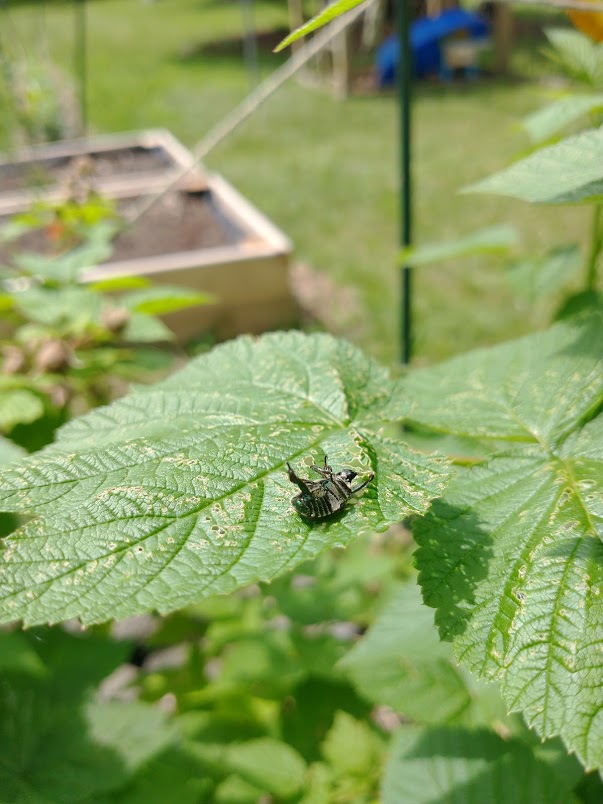 | A dead Japanese beetle that attempted to feed on a raspberry leaf treated with carbaryl the day prior. Photo: Annie Klodd |